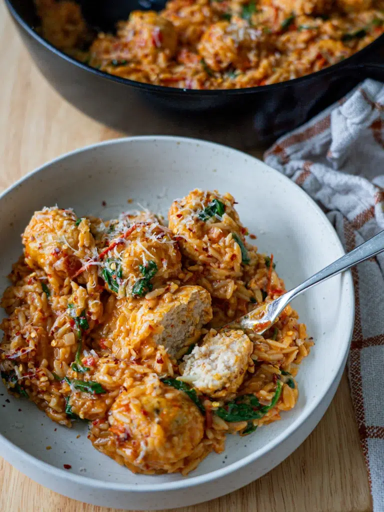 Juicy chicken meatballs meet creamy, garlicky risoni in this one-pan wonder. Marry Me Chicken Meatballs with Risoni (Orzo) is quick, easy and packed with flavour – perfect for a cosy night in. Serve it with extra parmesan (because more cheese is always a good idea).